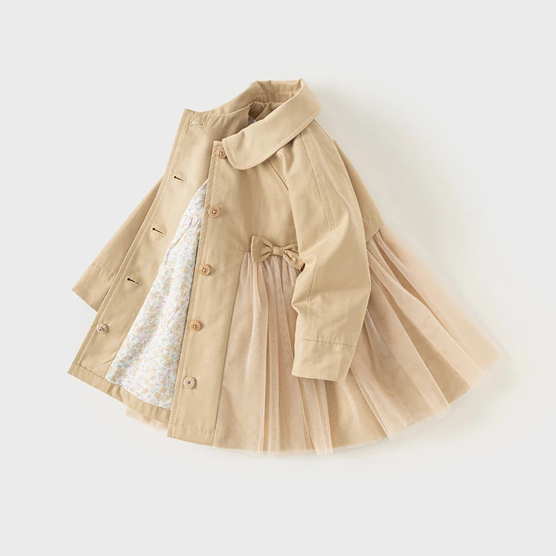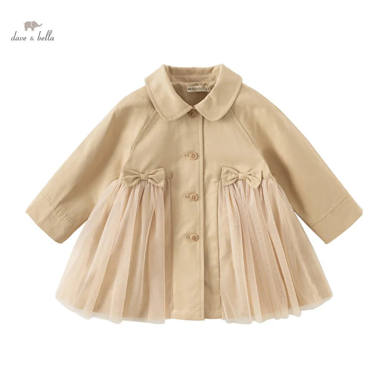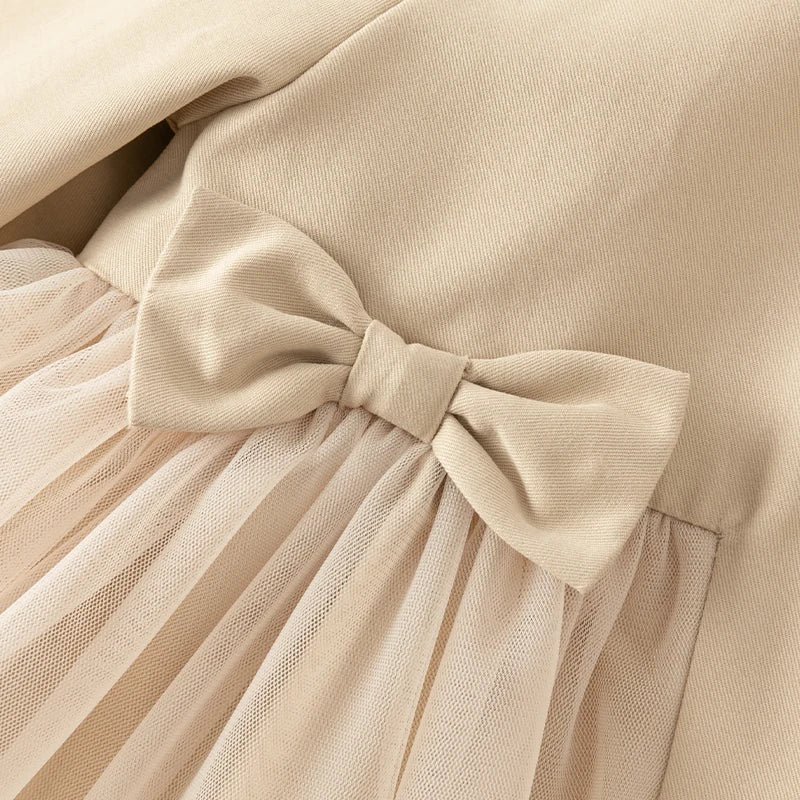 This elegant pea coat, designed for girls aged 2-7 years, is perfect for autumn and special occasions. Made from a high-quality cotton and nylon blend, it features a solid light camel color with a ruffled waist, adding a touch of charm. The flowy fabric below the waist is accentuated by two cute bows on the front, and the button-down front adds a classic touch. With full-length sleeves and a regular fit that stays true to size, this coat is ideal for layering over a dress or as a stylish outer layer for any special event.